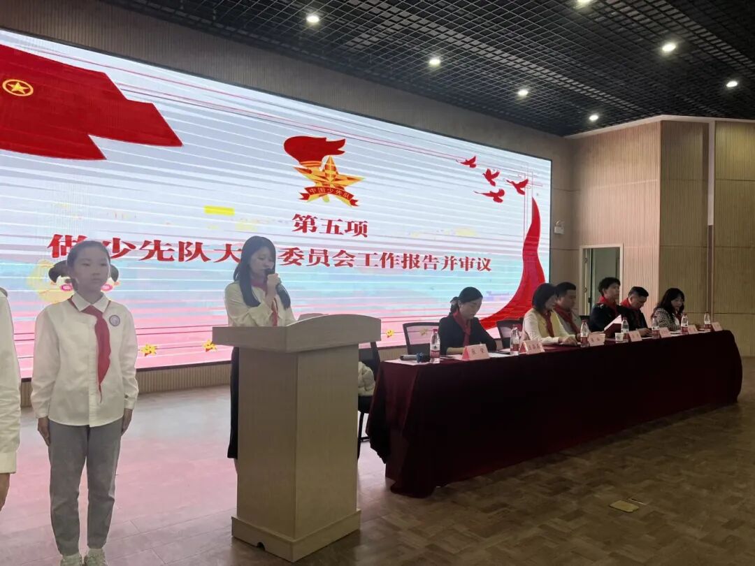 大队辅导员作工作报告,全面总结少先队工作成果与发展规划,代表们举手审议,行使民主权利。