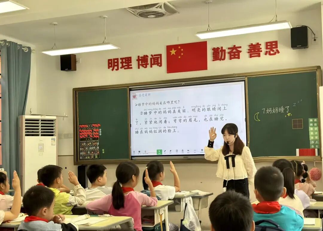 她的课堂是“五YUE”课程的生动注脚:拼音字母变成“四声儿歌”里的音符,孩子们拍着手唱着“ā á ǎ à,小兔跳台阶”。生字学习化身捉迷藏游戏,在教室绿植角找藏着的“木”“草”等字卡。为了让内向的孩子敢开口,她创设“小老师领读”岗位,用“你读得比春风还温柔”的夸赞,让自信的嫩芽破土而出。