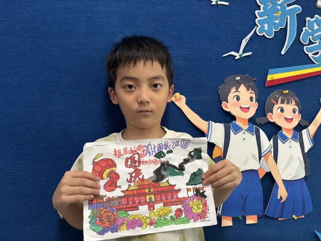 **“我想让祖国妈妈永远漂亮!”“祝祖国像太阳一样闪亮!”**假期里,一二年级的同学们化身“小小追梦人”,用画笔与歌声为祖国送上真挚祝福。他们拿起五彩颜料,一笔一画勾勒出国旗的鲜红底色与五星的璀璨光芒,或是细致描绘天安门的庄严轮廓。明快的色彩里,满是孩童们对祖国最纯粹的美好想象。完成画作后,孩子们又对着镜头录制童声视频,用稚嫩却真诚的话语诉说心意。不少家庭还特意组织“童心祝福小合唱”,家长与孩子并肩歌唱,悠扬的旋律里,爱国的种子在幼小的心田悄然发芽、静静生长。