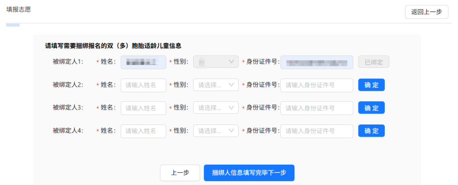 上一步骤勾选 “ 是 ,我自愿选择双(多)胞胎捆绑报名同一所学校。”,点击“下一步”后,请按系统提示填写需要捆绑报名的双(多)胞胎适龄儿童信息,只需要填写被捆绑人的姓名、性别、身份证件号,点击“确定”按钮,完成双胞胎捆绑。如果是多胞胎,继续填写下一个被捆绑学生信息,并点击“确定”按钮,直至所有需要捆绑的多胞胎学生都捆绑完成。若信息填写有误,系统将提示无法完成捆绑。