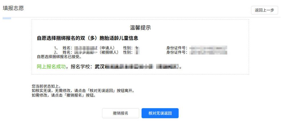 报名操作只能由申请人进行,操作步骤和单个学生报名步骤相同。选择报名学校并确认提交后,所有捆绑的双(多)胞胎学生将报名同一所学校。提交志愿后在报名时间段内,仍可修改志愿信息,点击 “ 撤销报名 ”,按系统提示操作,即可进行撤销后重新报名。