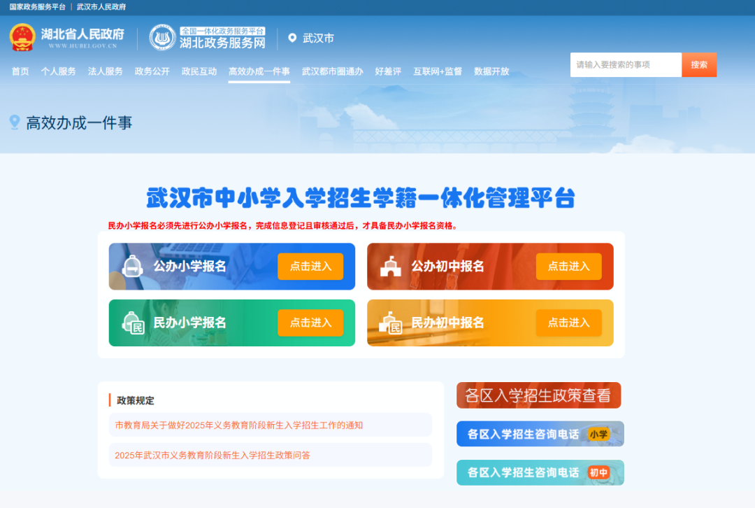 **方式一:**访问湖北政务服务网“高效办成一件事”专区,进入教育入学“一件事”或者鄂汇办APP办理。