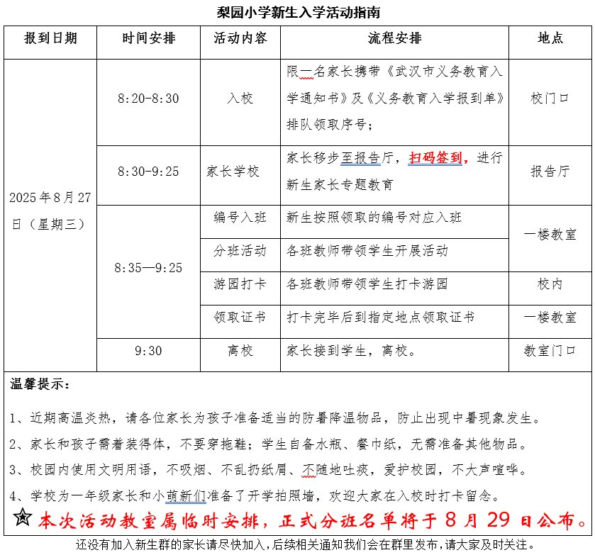 您好!祝贺您的孩子成为我校2025级一年级新生!这是一个充满期待与喜悦的时刻,我们诚挚邀请您与孩子共同参加2025年8月27日(星期三)的梨园小学新生入学活动,开启孩子小学生活的美好篇章。