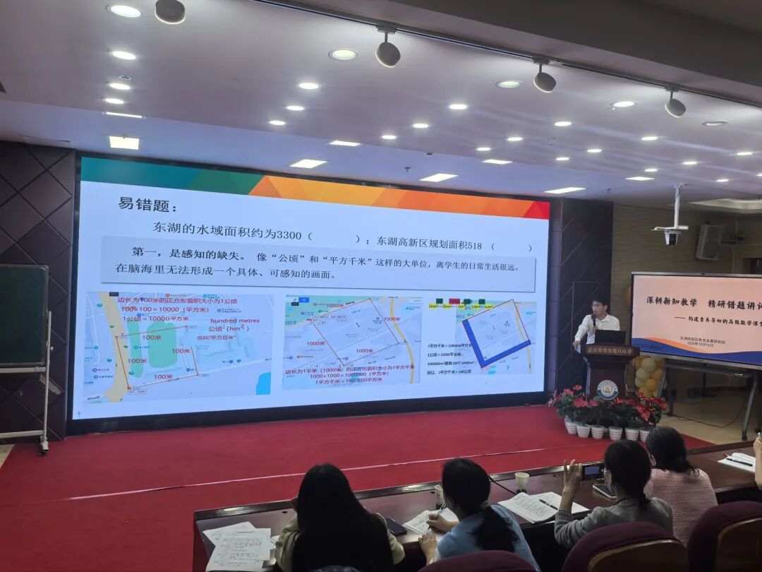 紧接着,光谷八小李文昌老师以《立足错题 循证教学 实践反思》为题,从错题研究的视角分享了教学改进的实践智慧。李老师认为,错题是洞察学生思维过程的窗口,教师应当透过错误表象,读懂学生的思维“暗角”。他通过“单位换算”“商的变化规律”“减法的性质”等十多个典型错例,详细阐述了如何通过错题分析重构教学路径。特别值得一提的是,李老师关于“例题后的第一道习题应该如何教学”的深刻剖析,在现场引发了广泛共鸣。以教学“已知一个数的几分之几是多少,求这个数”为例,李老师指出,若在例题教学后过早引入易混淆题型对比,反而会适得其反,导致学生“乘除不分”的困惑,例题后的第一道习题,核心功能应是让学生“试着用一次”,即在相似情境中实现“模型结构与新知的顺利对接”,而非急于进行变式或辨析。这一观点为教师们把好新知巩固的“第一关”提供了明确指引。